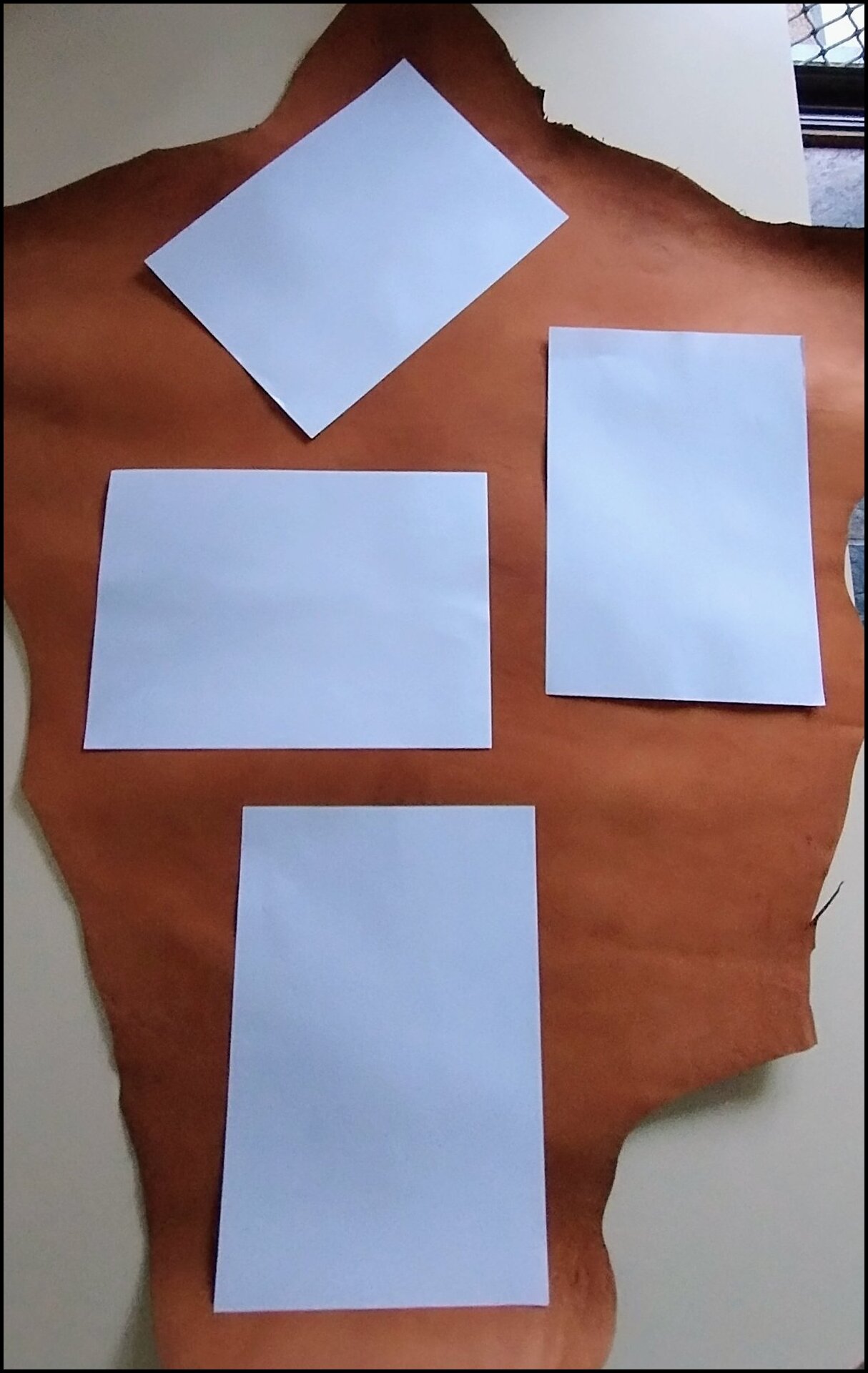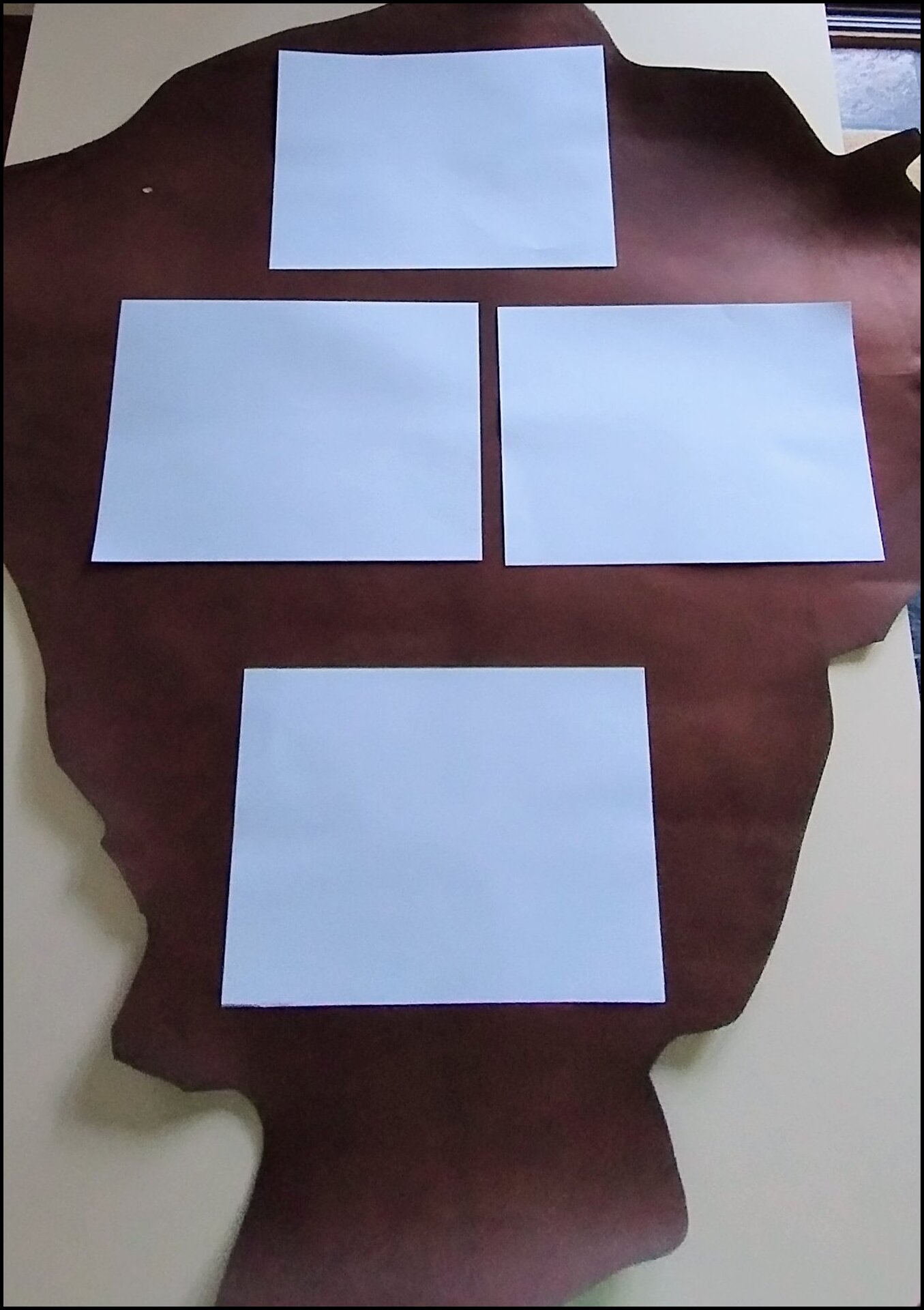 Laying out papers to determine approximate numbers - inner leather is darker brown called Brandy